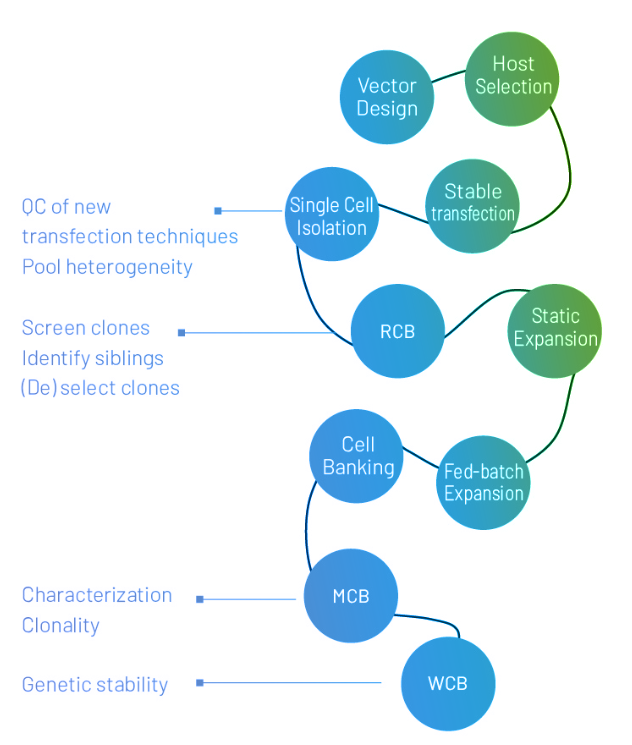 The genetic stability is recommended in WHO by comparing the profiles in both MCB/WCB and ECB/EOPC. The aspects such as the copy number of GOI (gene of interest), the location of GOI, and the sequences using sanger sequencing should be included.